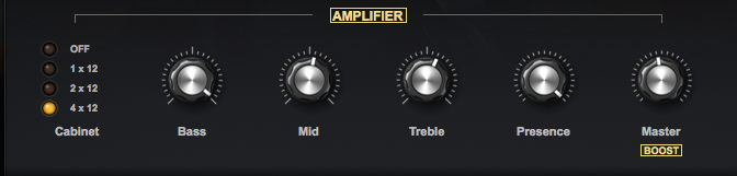 Cabinet allows you to choose the type of speaker cabinet. 1 × 12 is a smaller enclosure with one 12” speaker, 2 × 12 is a medium enclosure with two 12” speakers, and 4 × 12 is a larger cabinet with four 12” speakers.