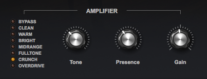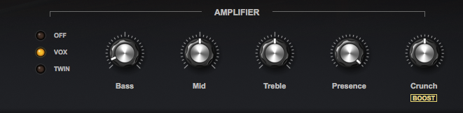 Crunch overdrives the pre-amp stage and BOOST adds volume (like a “high-gain” switch).