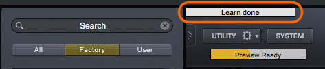 2. Next, send a Program Change, move a Continuous Controller or play a note (depending on the message selected in the previous step) on your controller. Keyscape will display a brief message (“Learn Done”) above the Utility Menu.