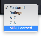 When sounds are sorted by “MIDI-Learned” order, the MIDI-Learned sounds will move to the top and their assigned MIDI message will be displayed underneath their names.