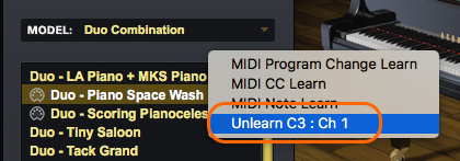 If you wish to delete the MIDI Learn assignment for a specific sound, Right/Control-click on the name and select “Unlearn” from the menu.
