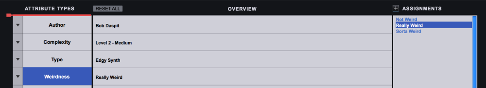 All of Omnisphere’s factory sounds have at least three ATTRIBUTE TYPES assigned to them, and can have up to eight ATTRIBUTE TYPES. Each ATTRIBUTE TYPE can have multiple ATTRIBUTE ASSIGNMENTS.