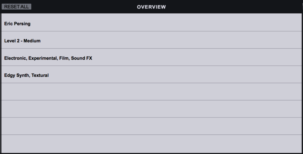 The “RESET ALL” button in the Overview area will clear all ASSIGNMENTS for all Attribute Types. If this button was selected accidentally, the RESET can be undone by immediately pressing the CANCEL button on the Edit Tags screen.
