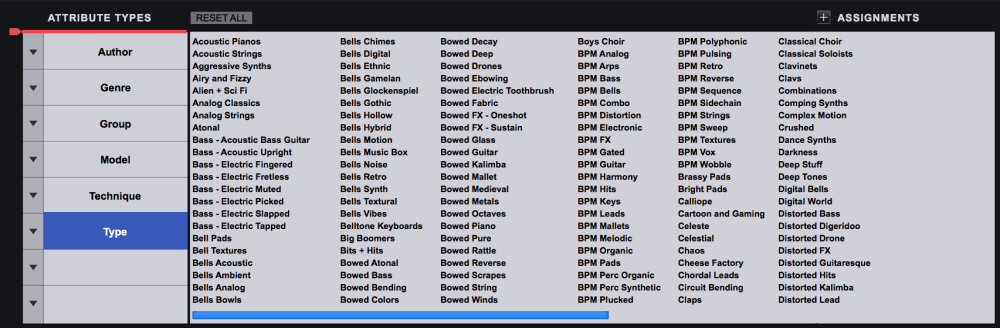 The ASSIGNMENTS column displays a list of Tags that can be added to an Attribute Type.These are typically descriptive words or labels, and will change depending on the Attribute Type selected. When you add an ASSIGNMENT to a sound using the ASSIGNMENTS column, it will be added to the selected Attribute Type, and can be used later to locate the sound using the search feature of the Browser.
