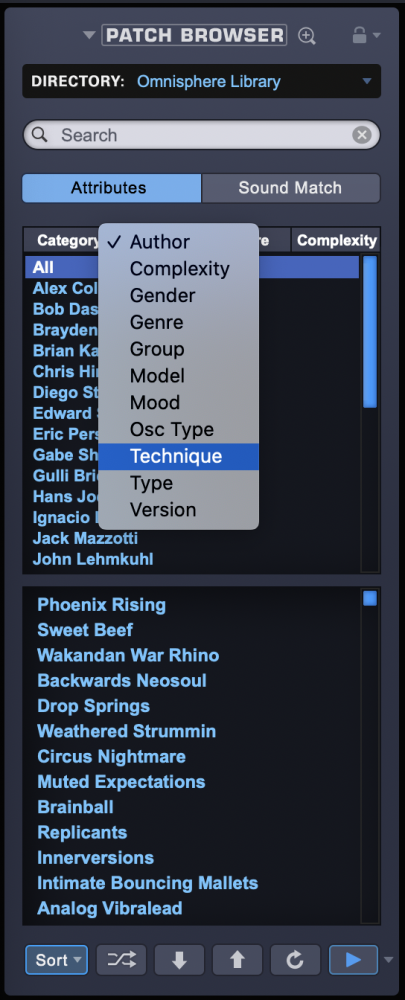 In Attributes Mode, there are four selectable Browser Filters, which display Category and three context-sensitive Attributes for searches based on the tags that have been added to the sounds. When a Category or an Attribute has been changed from All, the title changes to blue, to let you know it is filtered.