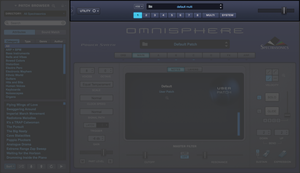 The Header contains the Utility Menu, Multi Information, (including the Multi Name Display) and access to the MULTI Browser, the Hardware Profiles, indicators for when LIVE MODE or STACK MODE are enabled, and Navigation Buttons for selecting any of the 8 Parts, the MULTI Section or the SYSTEM Page. Finally, there is a Master Volume Control for adjusting the overall output level and a “collapse” arrow to the left of the Utility Menu which allows you to open or close the sidebar.