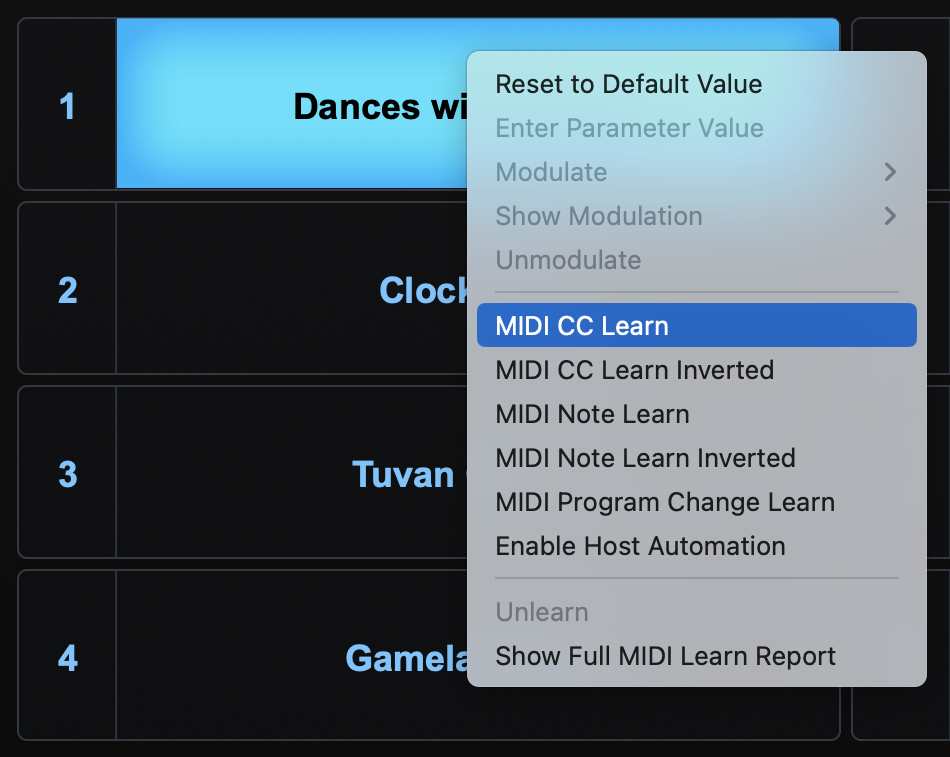 To MIDI-Learn a Part, Right/Control-click on its Slot to open the contextual menu, then choose the Part selection method you would like to MIDI Learn.