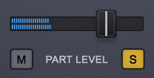 This slider determines the overall volume of the selected Part. This slider, and the Mute/Solo switches are the same as the Mute/Solo and Part Level control on the Mixer page.