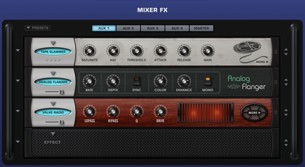 Each of the four Aux Sends has its own FX Rack (accessed by selecting the FX Button at the top of the MIXER). The AUX 1~AUX 4 knobs let you control the amount of FX applied to the Part.