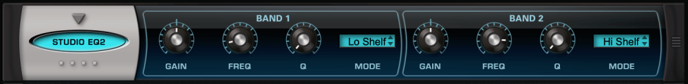 The STUDIO EQ is a clean, versatile, 2-band parametric EQ that provides multiple modes for each band. In addition to Peaking mode, where you choose which frequencies to scoop or boost, the controls include High and Low shelving and highpass / lowpass filtering.