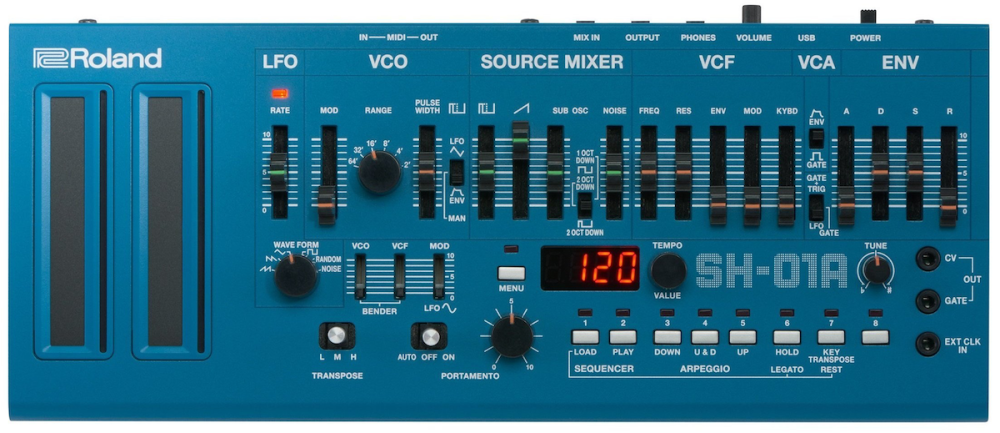 The Roland SH-01A is great for bass and you can use it with all kinds of Patches to control the level of Omnisphere’s four Layers. You can also detune the first two using the tuning knob and the sequencer sends the notes via MIDI. The controls are larger on this Boutique model, so they feel pretty good. If you want basic controls like Layer mix, Filter, Envelopes, and basic modulation in a highly portable, USB-powered synth for a reasonable price this is a very good choice.
