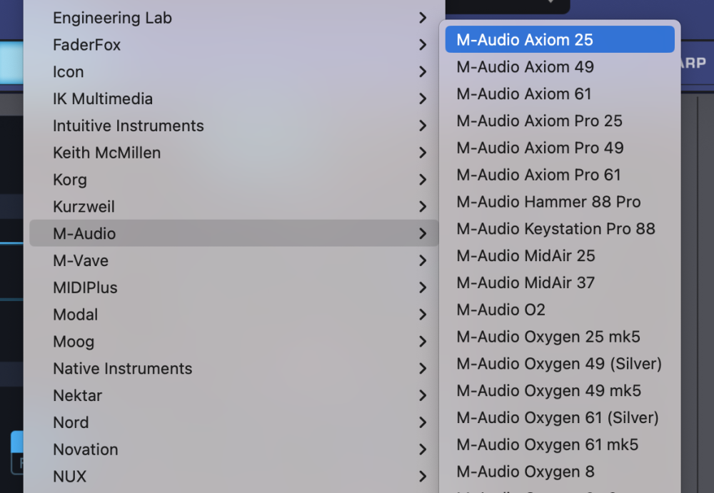 - From the drop-down menu, select “M-Audio > M-Audio Axiom 25” to activate the Axiom 25 hardware profile.