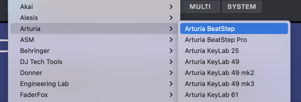 - From the drop-down menu, select “Arturia > Arturia BeatStep” to activate the BeatStep hardware profile.
