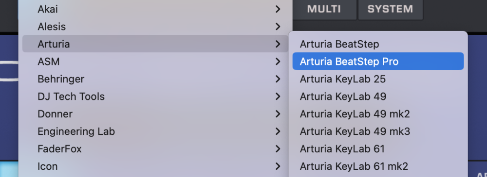 - From the drop-down menu, select “Arturia > Arturia BeatStep” to activate the BeatStep hardware profile.
