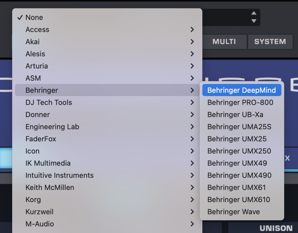 From the drop-down menu, select Behringer>Behringer DeepMind to activate that hardware profile.