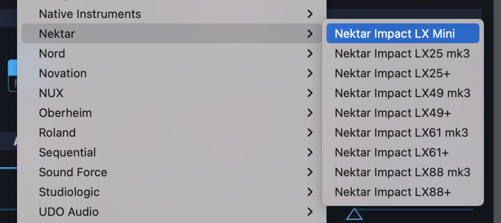 - From the drop-down menu, select “Nektar > Nektar Impact LX Mini” to activate the Impact LX Mini hardware profile.