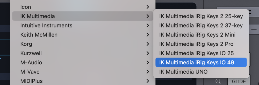- From the drop-down menu, select “IK Multimedia > IK Multimedia iRig Keys IO 49” to activate the iRig Keys IO 49 hardware profile.