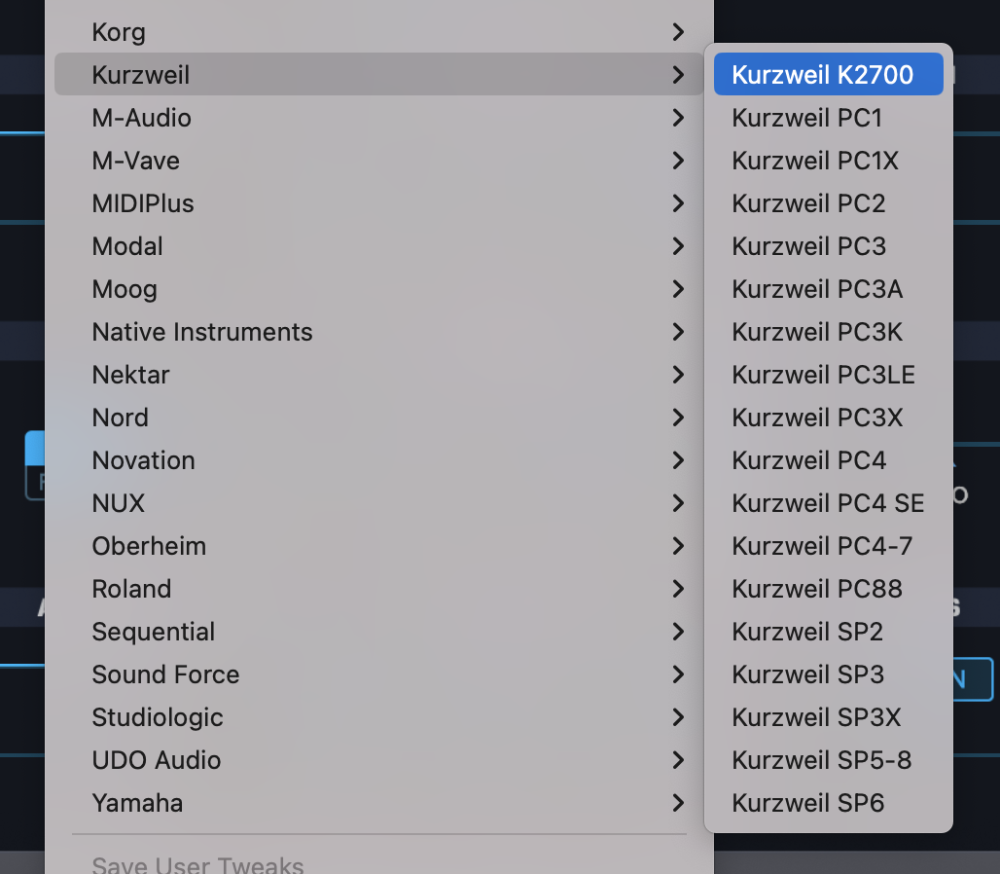 - From the drop-down menu, select “Kurzweil > Kurzweil K2700” to activate the K2700 hardware profile.