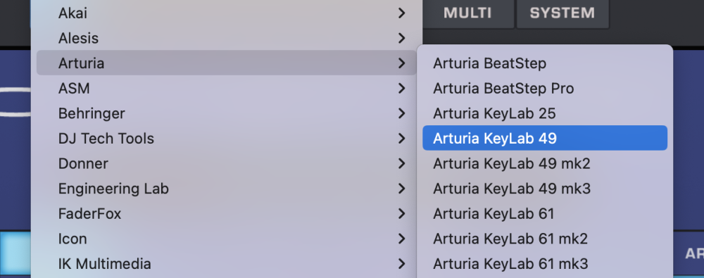 - From the drop-down menu, select “Arturia > Arturia KeyLab 49” to activate the KeyLab 49 hardware profile.
