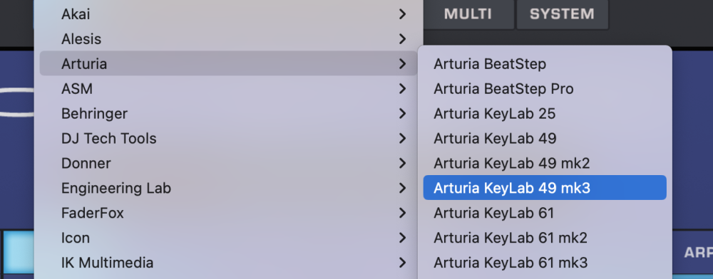 - From the drop-down menu, select “Arturia > Arturia KeyLab 49 mk3” to activate the KeyLab 49 mk3 hardware profile.