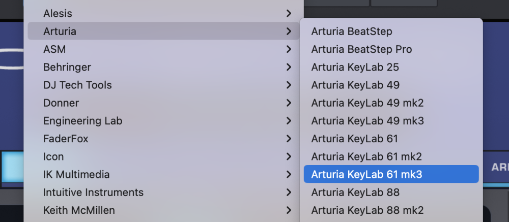 - From the drop-down menu, select “Arturia > Arturia KeyLab 61 mk3” to activate the KeyLab 61 mk3 hardware profile.