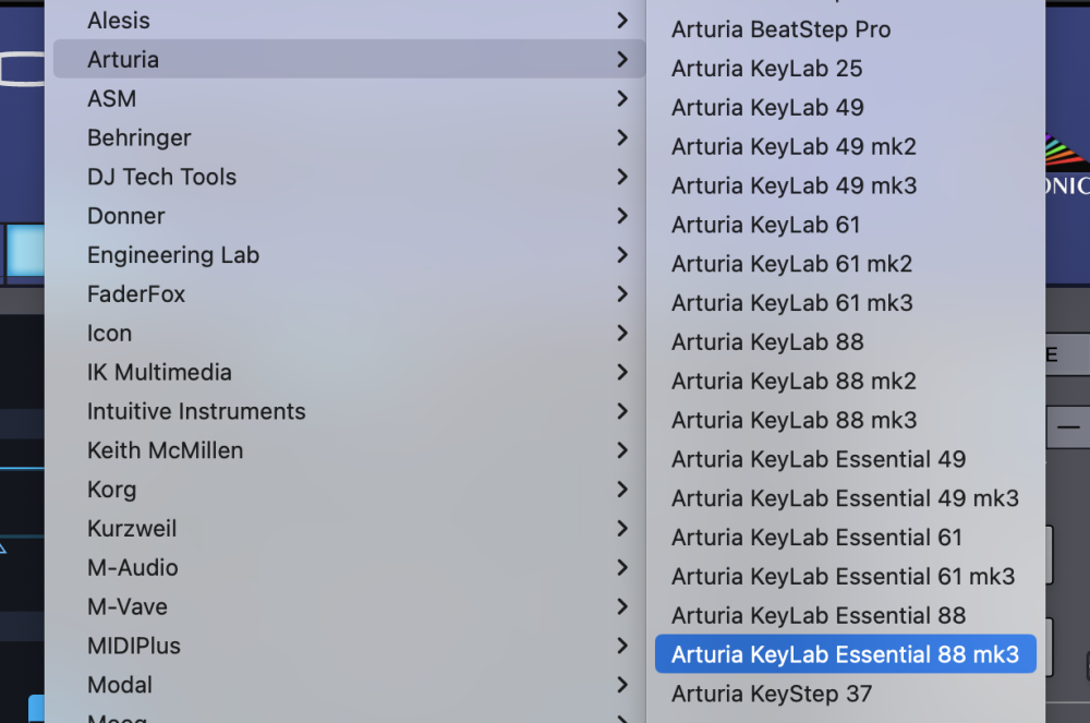 - From the drop-down menu, select “Arturia > Arturia KeyLab Essential 88 mk3” to activate the KeyLab Essential 88 mk3 hardware profile.