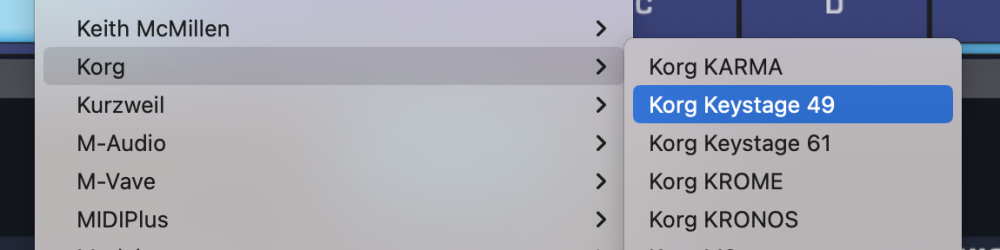 - From the drop-down menu, select “Korg > Korg Keystage 49” to activate the Keystage 49 hardware profile.