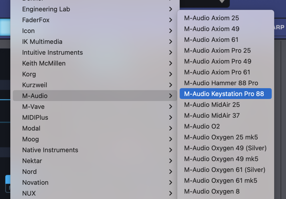 - From the drop-down menu, select “M-Audio > M-Audio Keystation Pro 88” to activate the Keystation Pro 88 hardware profile.