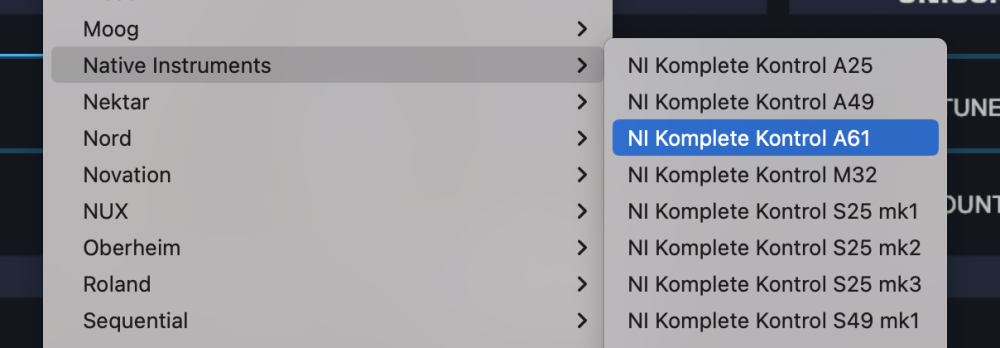 - From the drop-down menu, select “Native Instruments > NI Komplete Kontrol A61” to activate the Komplete Kontrol A61 hardware profile.