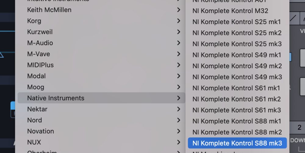 - From the drop-down menu, select “Native Instruments > NI Komplete Kontrol S88 mk3” to activate the Komplete Kontrol S88 mk3 hardware profile.