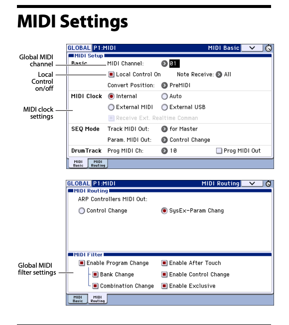 - Press the [GLOBAL] button and navigate to the “P1: MIDI” page
