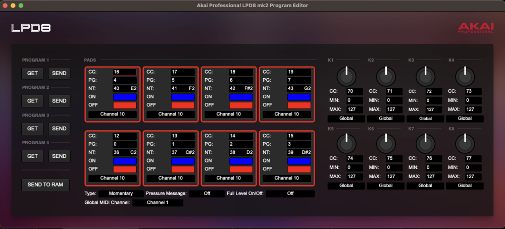 NOTE: If you need to change the MIDI CC#s of the knobs on the LPD8 mk2, you’ll need to use the Akai Professional LPD8 mk2 Program Editor application to either restore program 1 or manually reconfigure the program to match the MIDI CC#s listed above.