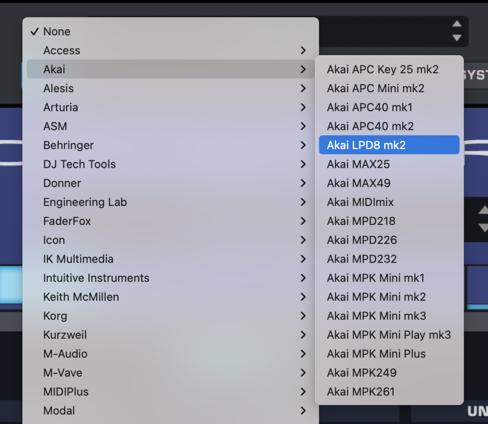 - From the drop-down menu, select “Akai > Akai LPD8 mk2” to activate the LPD8 mk2 hardware profile.