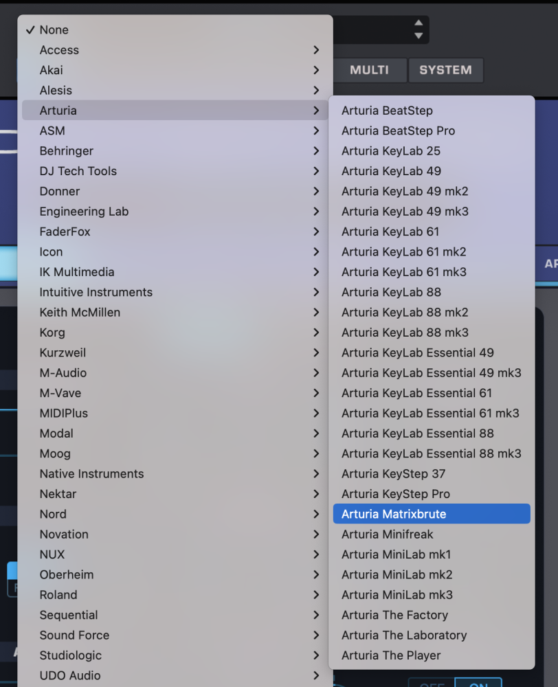 From the drop-down menu, select “Arturia>Arturia Matrixbrute” to activate that Hardware Profile.