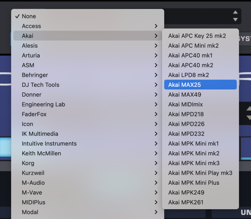 - From the drop-down menu, select “Akai > Akai MAX25” to activate the MAX25 hardware profile.