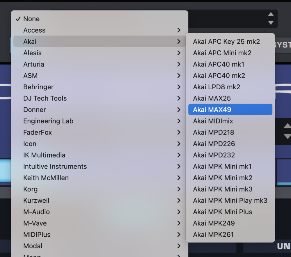 - From the drop-down menu, select “Akai > Akai MAX49” to activate the MAX49 hardware profile.