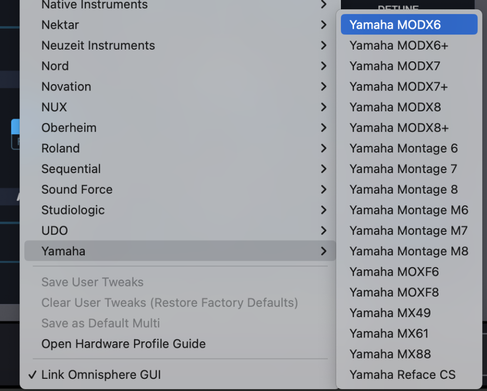 - From the drop-down menu, select “Yamaha > Yamaha MODX”, and activate the MODX hardware profile that matches your keyboard.
