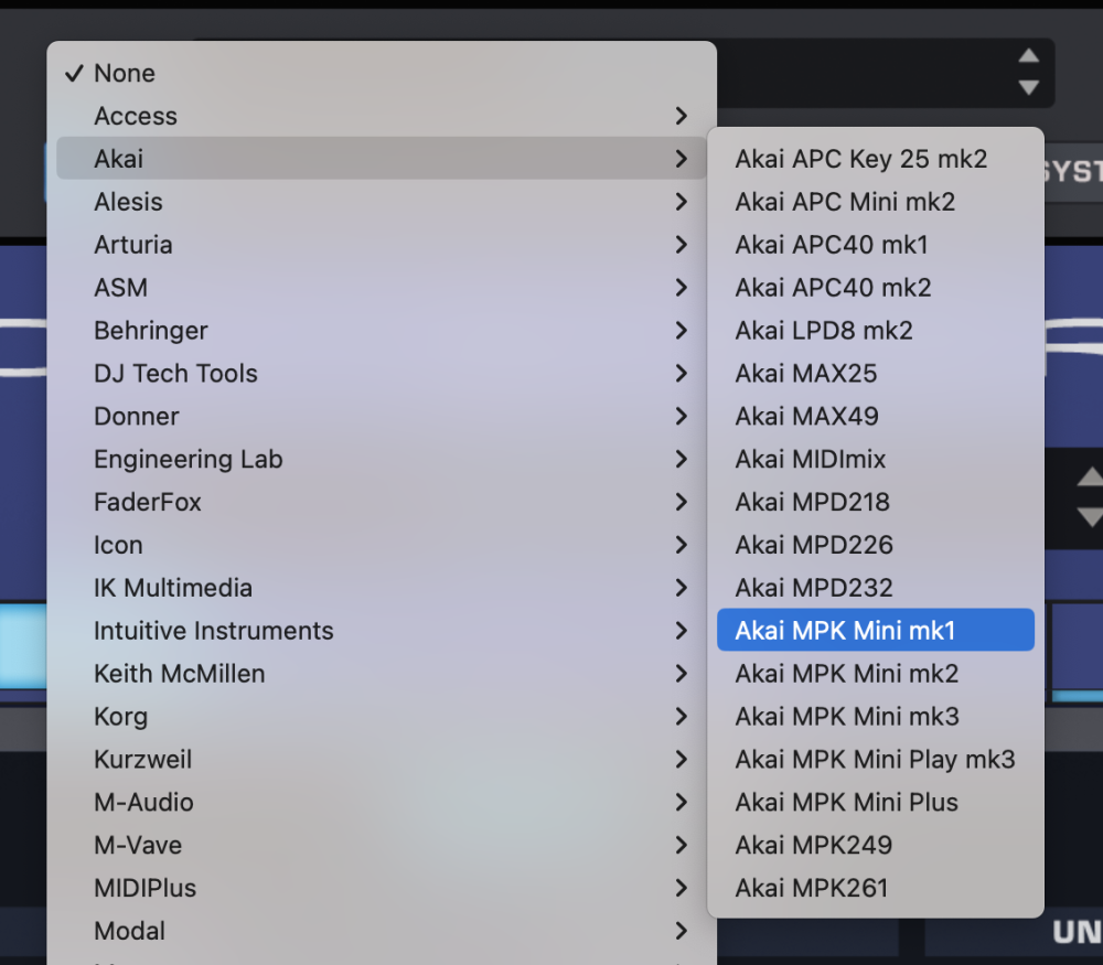 - From the drop-down menu, select “Akai > Akai MPK Mini mk1” to activate the MPK Mini mk1 hardware profile.