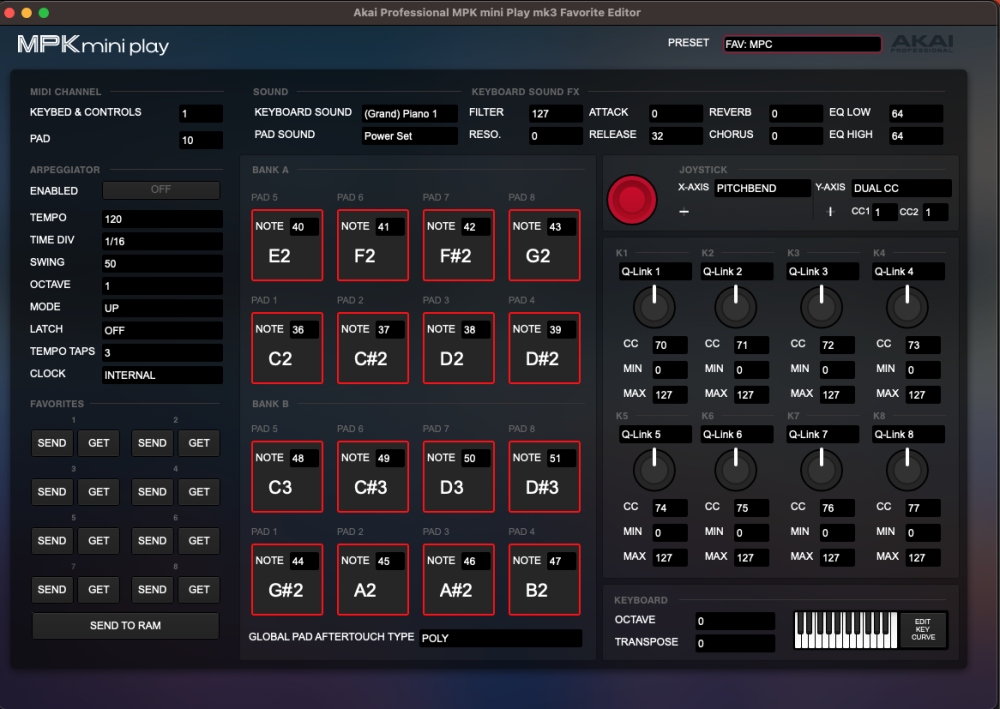NOTE: If you need to change the MIDI CC#s of the knobs on the MPK Mini Play mk3, you’ll need to use the Akai Professional MPK Mini Play mk3 Favorite Editor application to either restore FAV 1 or manually recofigure the preset to match the MIDI CC#s listed above.