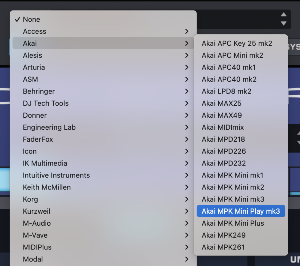 - From the drop-down menu, select “Akai > Akai MPK Mini Play mk3” to activate the MPK Mini Play mk3 hardware profile.