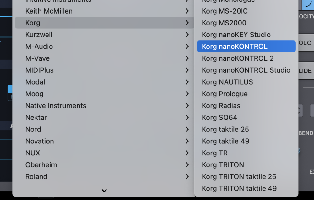 - From the drop-down menu, select “Korg > Korg nanoKONTROL” to activate the nanoKONTROL hardware profile.