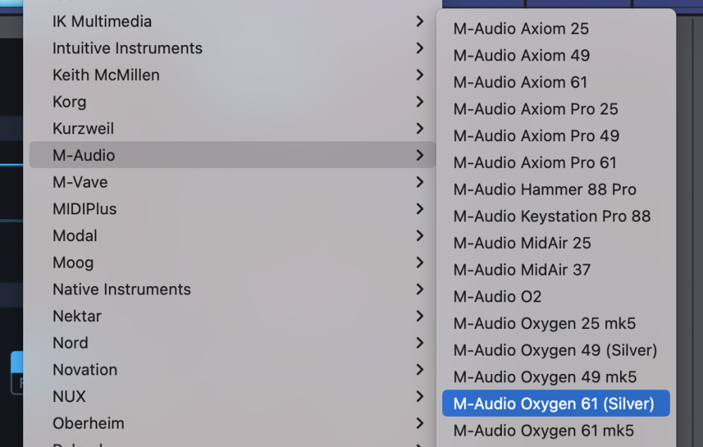 - From the drop-down menu, select “M-Audio > M-Audio Oxygen 61 (Silver)” to activate the Oxygen 61 Hardware Profile.