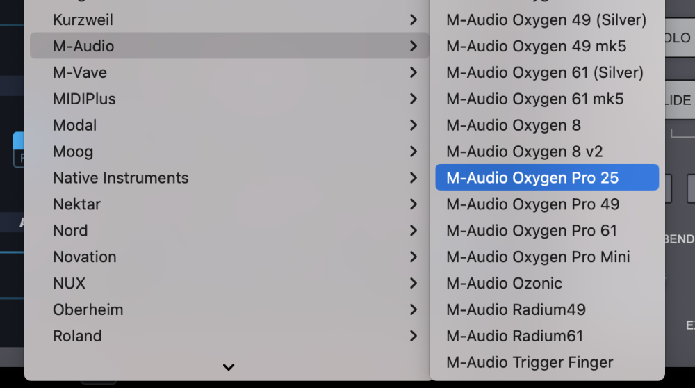 - From the drop-down menu, select “M-Audio > M-Audio Oxygen Pro 25” to activate the Oxygen Pro 25 hardware profile.