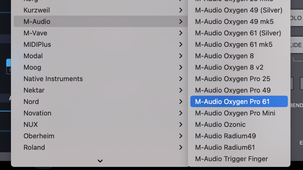 - From the drop-down menu, select “M-Audio > M-Audio Oxygen Pro 61” to activate the Oxygen Pro 61 hardware profile.