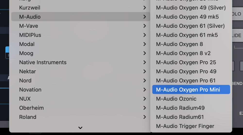 - From the drop-down menu, select “M-Audio > M-Audio Oxygen Pro Mini” to activate the Oxygen Pro Mini hardware profile.