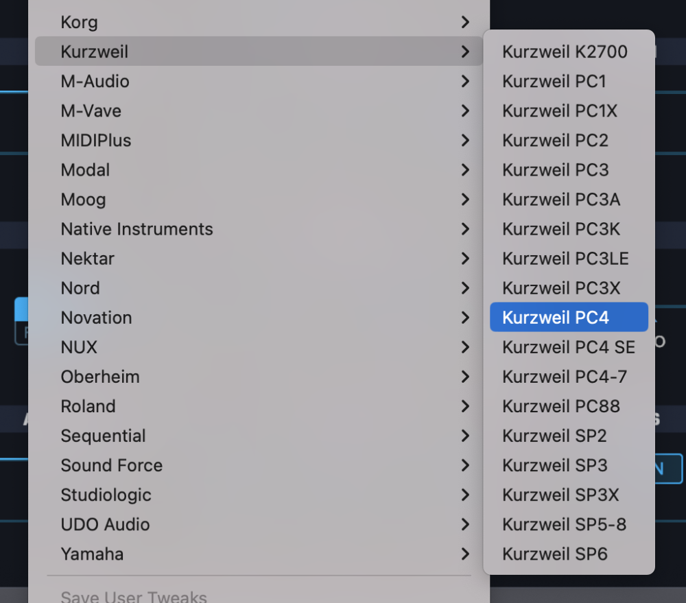 - From the drop-down menu, select “Kurzweil > Kurzweil PC4” to activate the PC4 hardware profile.