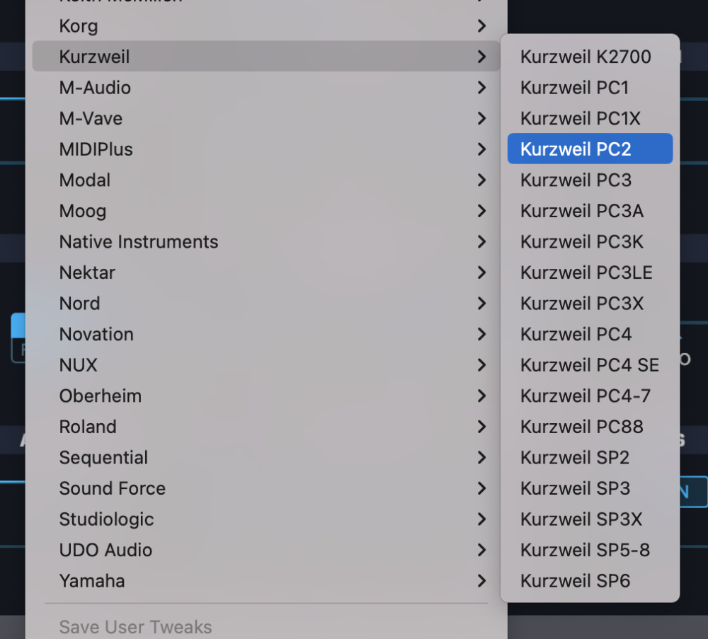 - From the drop-down menu, select “Kurzweil > Kurzweil PC2” to activate the PC2 hardware profile.