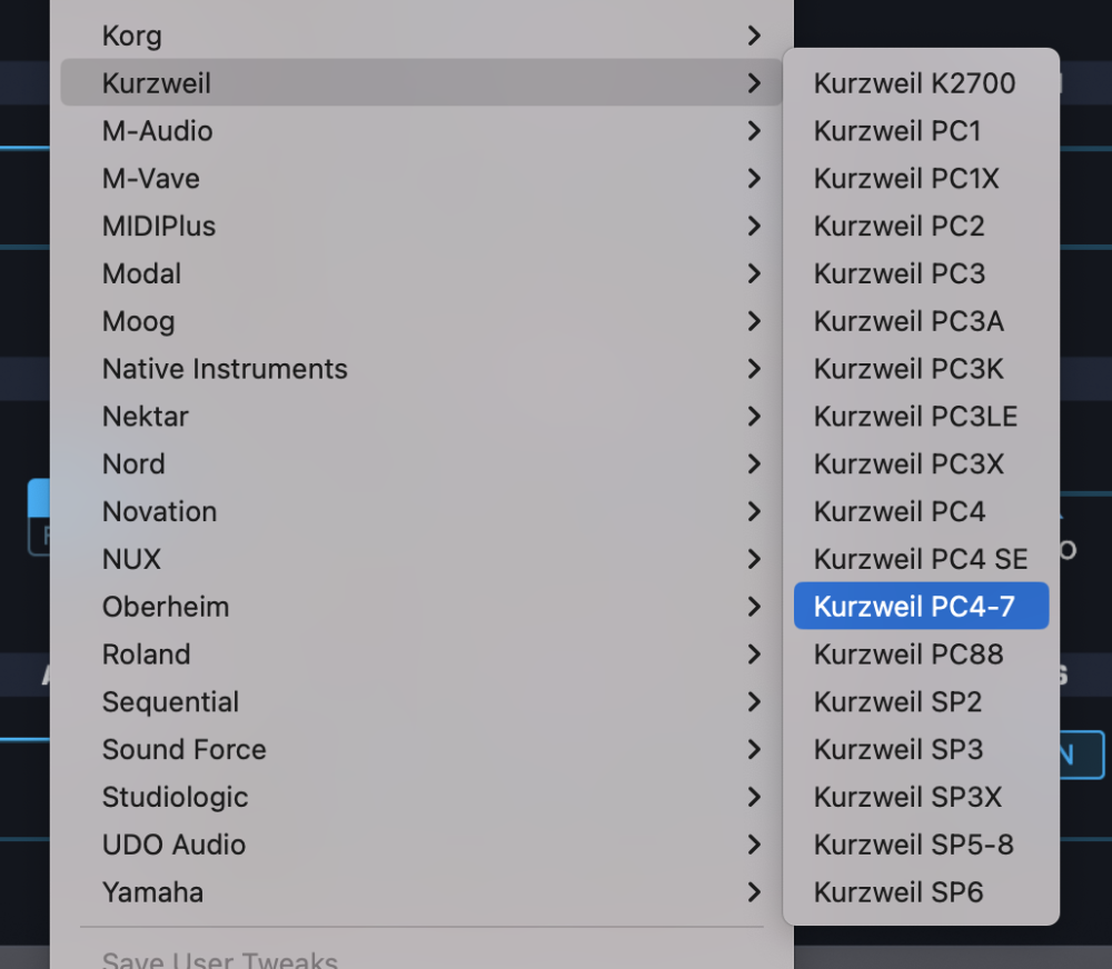 - From the drop-down menu, select “Kurzweil > Kurzweil PC4-7” to activate the PC4-7 hardware profile.
