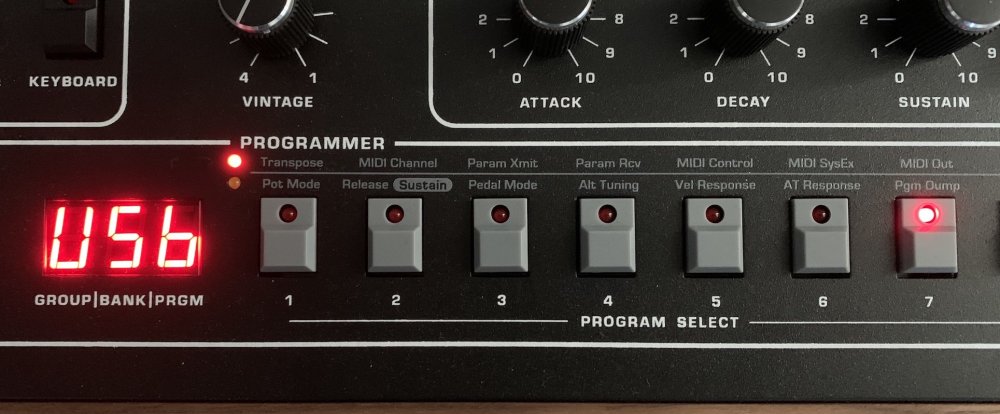 To make sure the controls in your Prophet 5 transmit MIDI through USB, press the GLOBALS button so the red LED is ON. Press the program selector button [7] and then use the BANK and TENS buttons to scroll forward and backward through parameter settings until the display reads USb to output MIDI only over USB or ALL to output MIDI over USB and the MIDI out port. Once you are done, press the GLOBALS button twice to exit.