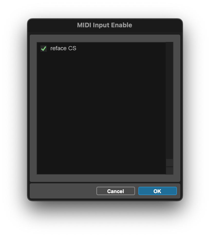 - Enable the Reface CS as a MIDI input device in the host software you’re using (DAW, Standalone, etc.).